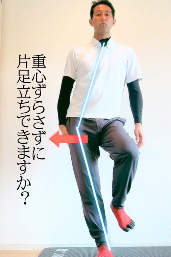 片脚立ちをした時に、「く」の字になってしまう人は一緒に練習しましょう。
